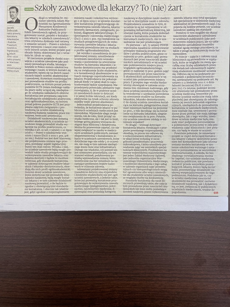 W dniu 30 września 2021 roku „Dziennik Gazeta Prawna” nr 190 zamieścił artykuł radcy prawnego Jacka Sobczaka pt.: „Szkoły zawodowe dla lekarzy ? To (nie) żart ?”.