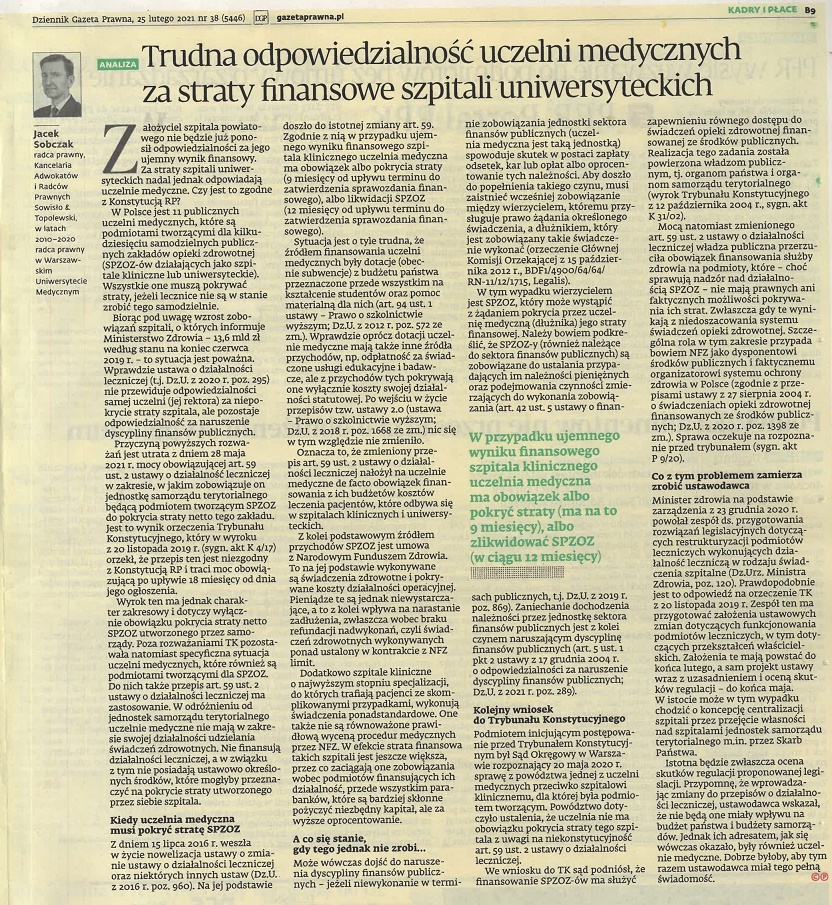 W dniu 25 lutego 2021 roku na łamach „Dziennika Gazeta Prawna” ukazał się artykuł mec. Jacka Sobczaka pt. „Trudna odpowiedzialność uczelni medycznych za straty finansowe szpitali uniwersyteckich”, poświęcony kwestii odpowiedzialności uczelni medycznych za ujemny wynik finansowy szpitali klinicznych.