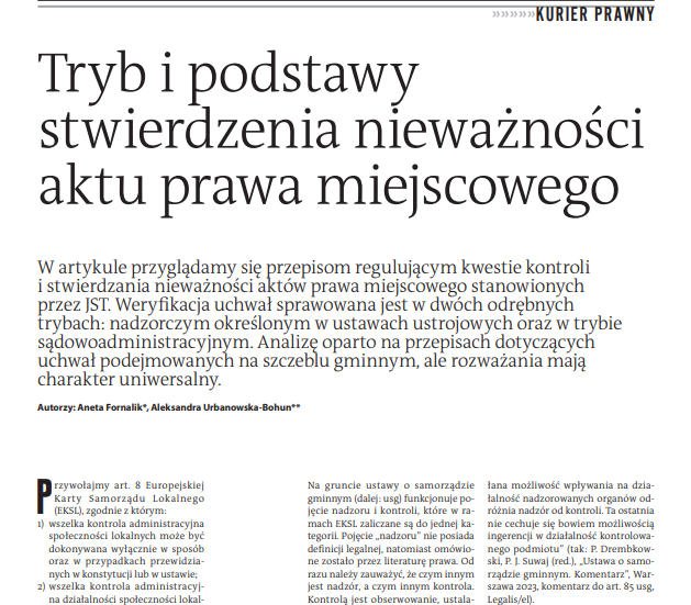 W dniu 4 maja 2024 r. Kurier Prawny – stały dodatek do Pisma Samorządu Terytorialnego „Wspólnota” opublikował artykuł „Tryb i podstawy stwierdzenia nieważności aktu prawa miejscowego” autorstwa adw. Anety Fornalik i r. pr. Aleksandry Urbanowskiej-Bohun.
