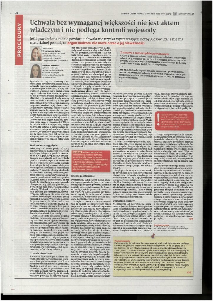 W dniu 7 kwietnia 2021 roku na łamach „Dziennika Gazety Prawnej” w dodatku – „Samorząd i Administracja” opublikowany został artykuł radcy prawnego Aleksandry Urbanowskiej-Bohun oraz aplikantki radcowskiej Angeliki Borowiak dotyczący podjętej przez Radę Powiatu uchwały, która nie uzyskała większości.