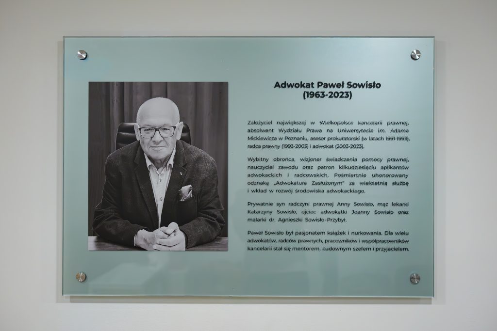 Z okazji drugiej rocznicy śmierci, w siedzibie Kancelarii, odbyła się uroczystość odsłonięcia tablicy pamiątkowej poświęconej śp. Adwokatowi Pawłowi Sowisło – założycielowi naszej Kancelarii. Było to wydarzenie o szczególnym znaczeniu dla całego Zespołu, stanowiące wyraz pamięci, wdzięczności oraz szacunku dla osoby, która stworzyła jej historię i tożsamość.