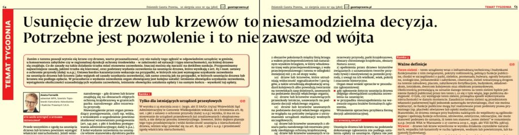 „Dziennik Gazeta Prawna” w swoim dodatku „Samorząd i Administracja” (nr 154) z dnia 10 sierpnia 2022 roku opublikował artykuł adwokat Anety Fornalik pt.: „Usunięcie drzew lub krzewów to niesamodzielna decyzja. Potrzebne jest pozwolenie i to nie zawsze od wójta” opisujący wybrane aspekty procedury usuwania drzew i krzewów z terenu nieruchomości.