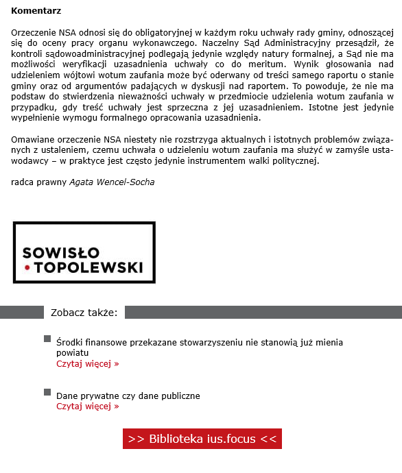 W najnowszym newsletterze serwisu: IUS.FOCUS-PRAWO ADMINISTRACYJNE ukazał się komentarz autorstwa r.pr. Agaty Wencel-Sochy, dotyczący konsekwencji braku uzasadnienia uchwały o wotum zaufania dla organów wykonawczych samorządu terytorialnego.