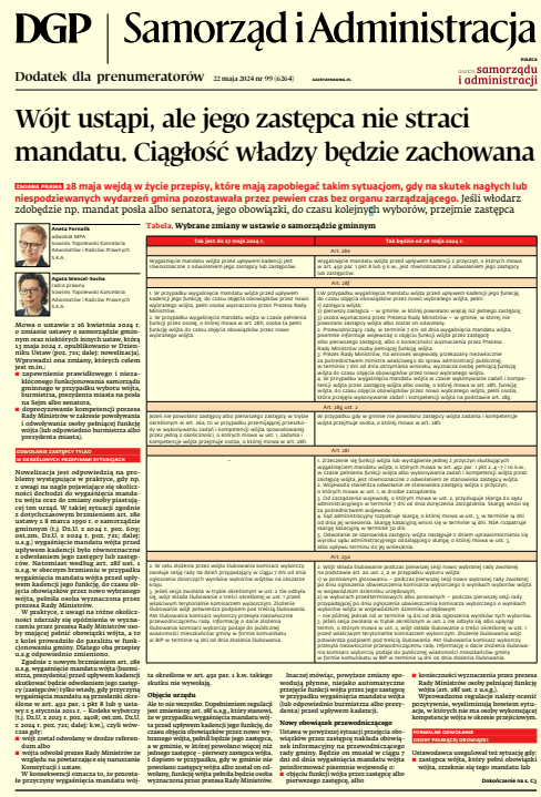 W najnowszym wydaniu dodatku Dziennika Gazety Prawnej – „Samorząd i Administracja” (nr 99) z dnia 22 maja 2024 r. opublikowano artykuł pt. „Wójt ustąpi, ale jego zastępca nie straci mandatu. Ciągłość władzy będzie zachowana” przygotowany przez adw. Anetę Fornalik oraz r. pr. Agatę Wencel-Sochę.