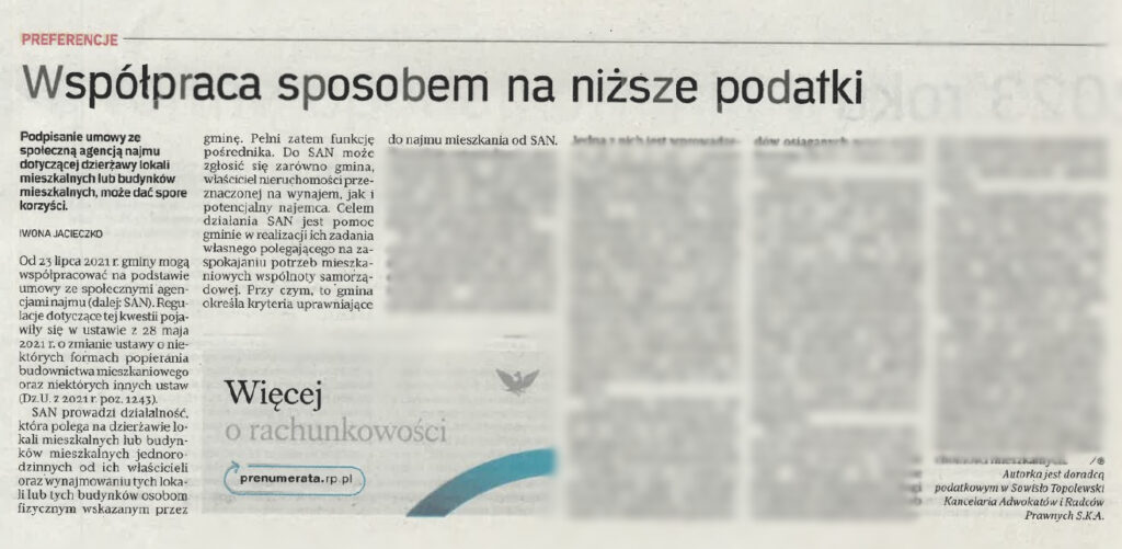 W dniu 20 lutego 2023 r. dziennik „Rzeczpospolita”, w swoim dodatku “Podatki i księgowość” opublikował artykuł „Współpraca sposobem na niższe podatki” autorstwa doradcy podatkowego Iwony Jacieczko.