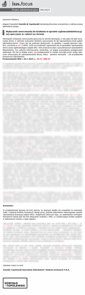 W newsletterze z września 2025 roku opublikowano komentarz dotyczący problematyki wykazywania umocowania do działania w sprawie sądowoadministracyjnej, pozostającego w całości po stronie uczestnika postępowania.
