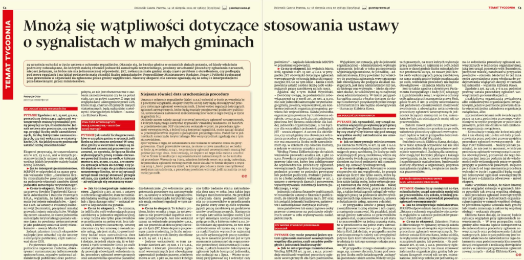 Wypowiedzi eksperckie r. pr. Marty Król w artykule „Ustawa o sygnalistach w małych gminach. Wątpliwości jest coraz więcej” opublikowanym w Dzienniku Gazeta Prawna