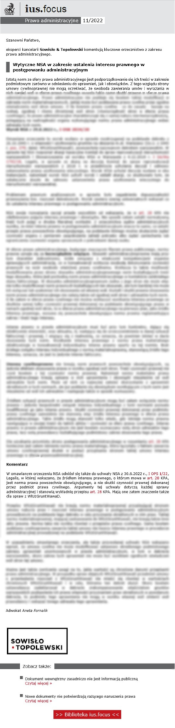 Teksty w module Serwisu: IUS.FOCUS-PRAWO ADMINISTRACYJNE są powierzone do redakcji wyłącznie naszej Kancelarii, co traktujemy jako wyraz uznania bogatego doświadczenia Kancelarii w obszarze prawa i postępowania administracyjnego. Możliwość komentowania bieżącego orzecznictwa sądów w ramach IUS.FOCUS z założenia skierowana jest do największych kancelarii prawniczych w skali kraju.