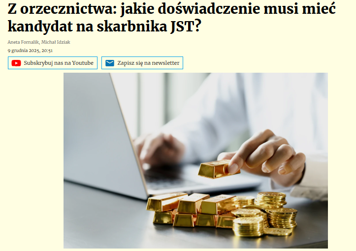 Autorzy analizują wyrok Wojewódzkiego Sądu Administracyjnego w Poznaniu, w którym wskazano, że za praktykę w księgowości można uznać również nadzór nad pracą księgowych, o ile obejmuje on realną kontrolę nad czynnościami z zakresu rachunkowości. Artykuł omawia wymagania stawiane kandydatom na stanowisko skarbnika JST na tle art. 54 ust. 2 pkt 5 ustawy o finansach publicznych oraz znaczenie orzecznictwa dla praktyki samorządowej.