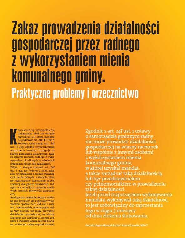 Dnia 15 czerwca 2024 r. został opublikowany artykuł „Zakaz prowadzenia działalności gospodarczej przez radnego z wykorzystaniem mienia komunalnego gminy” w Piśmie Samorządu Terytorialnego „Wspólnota”, którego autorkami są adw. Aneta Fornalik i r. pr. Agata Wencel-Socha.
