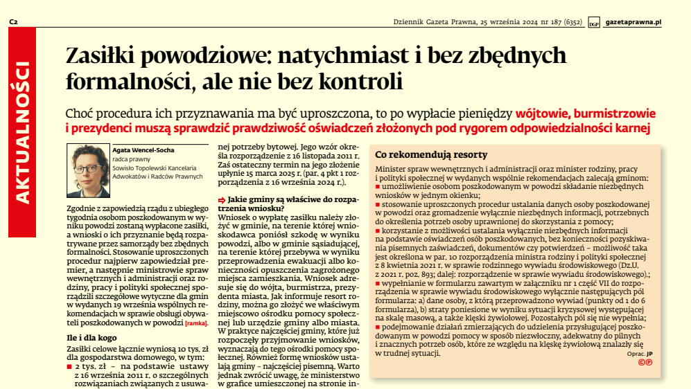 W dniu 25 września 2024 roku w dodatku „Samorząd i Administracja” Dziennika Gazeta Prawna, został opublikowany artykuł r. pr. Agaty Wencel-Sochy „Zasiłki powodziowe: natychmiast i bez zbędnych formalności, ale nie bez kontroli”.
