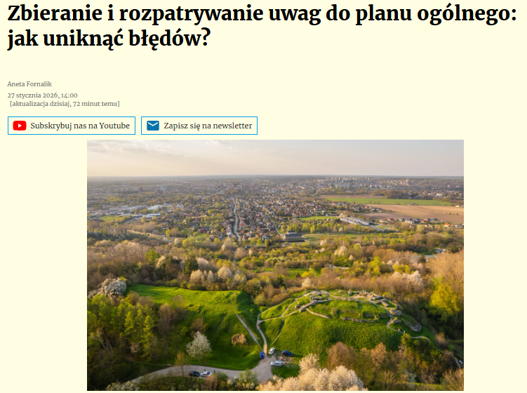 Publikacja stanowi praktyczny przewodnik po procedurze składania i analizy uwag do projektu planu ogólnego gminy. Artykuł wyjaśnia kluczowe wątpliwości związane z konsultacjami społecznymi oraz podkreśla znaczenie prawidłowego przeprowadzenia tego etapu dla ważności całej procedury planistycznej.