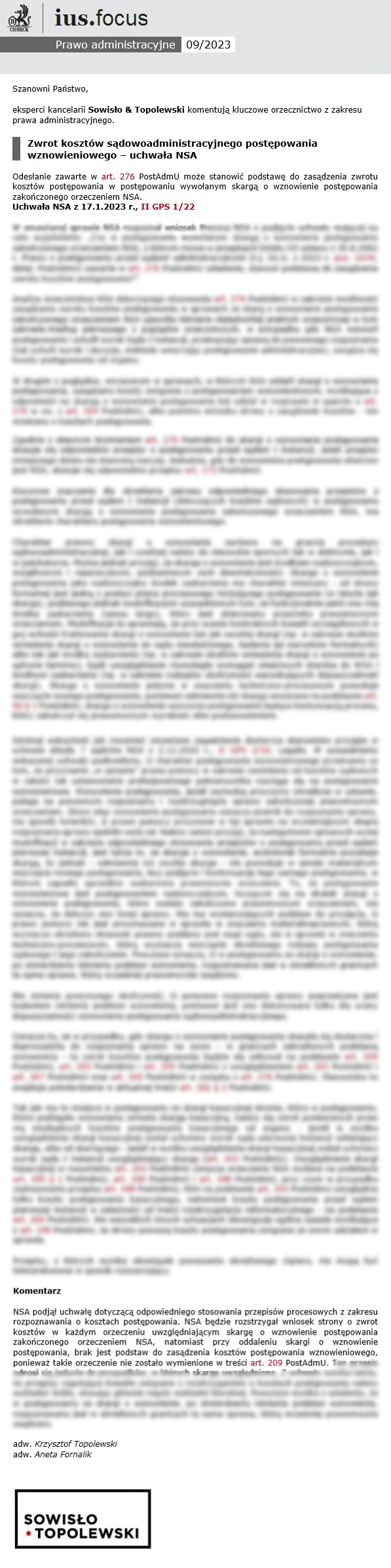 Teksty w module Serwisu: IUS.FOCUS-PRAWO ADMINISTRACYJNE są powierzone do redakcji wyłącznie naszej Kancelarii, co traktujemy jako wyraz uznania bogatego doświadczenia Kancelarii w obszarze prawa i postępowania administracyjnego. Możliwość komentowania bieżącego orzecznictwa sądów w ramach IUS.FOCUS z założenia skierowana jest do największych kancelarii prawniczych w skali kraju.