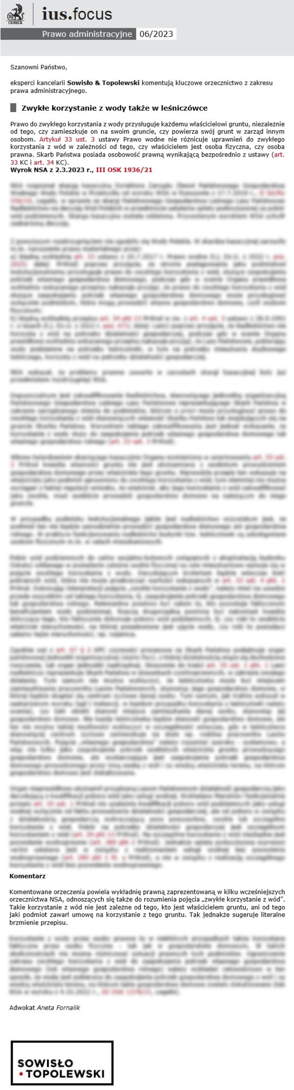 W najnowszym newsletterze z miesiąca czerwca 2023 roku udostępniony został komentarz na temat „Zwykłego korzystania z wody także w leśniczówce”.